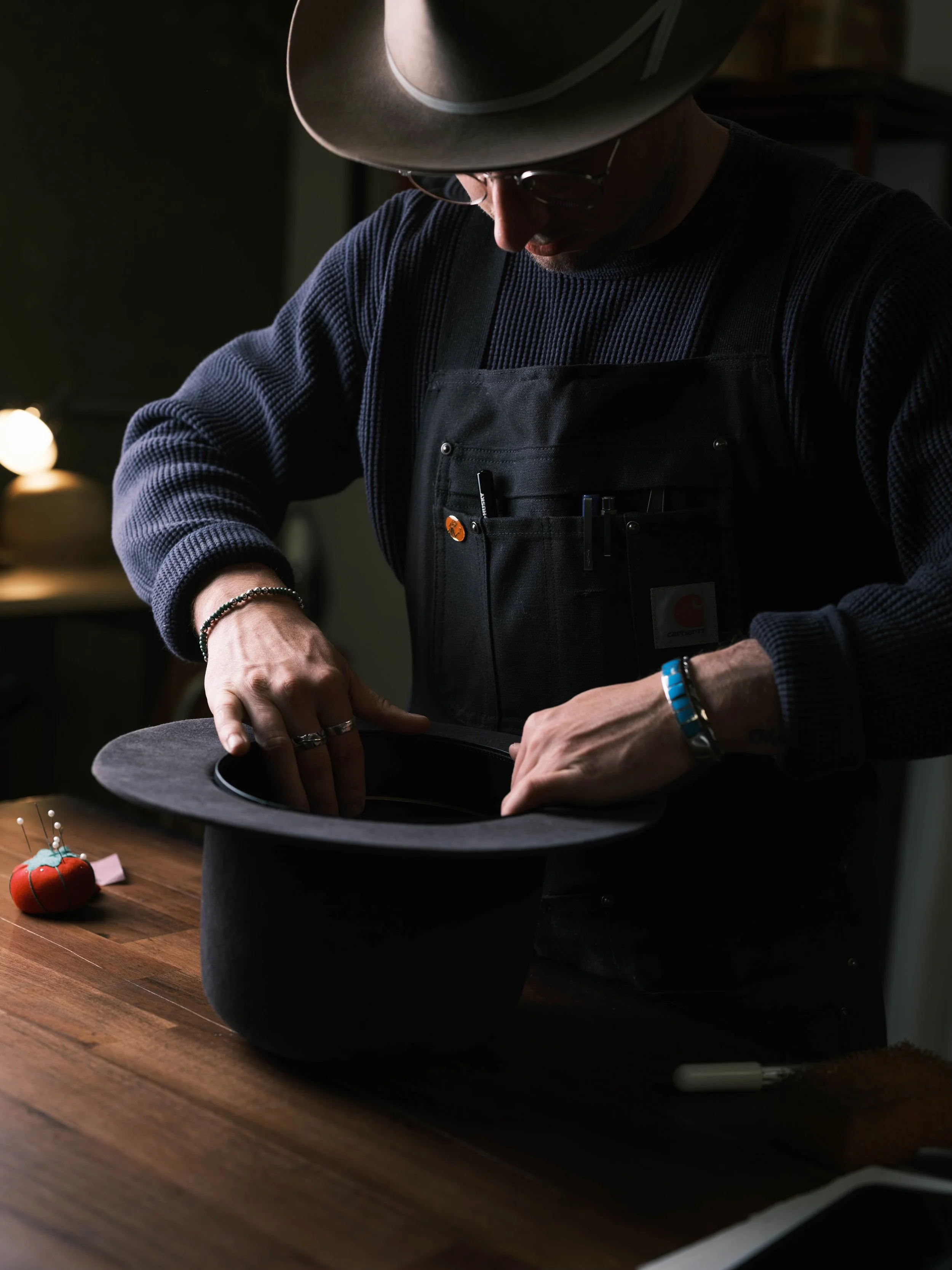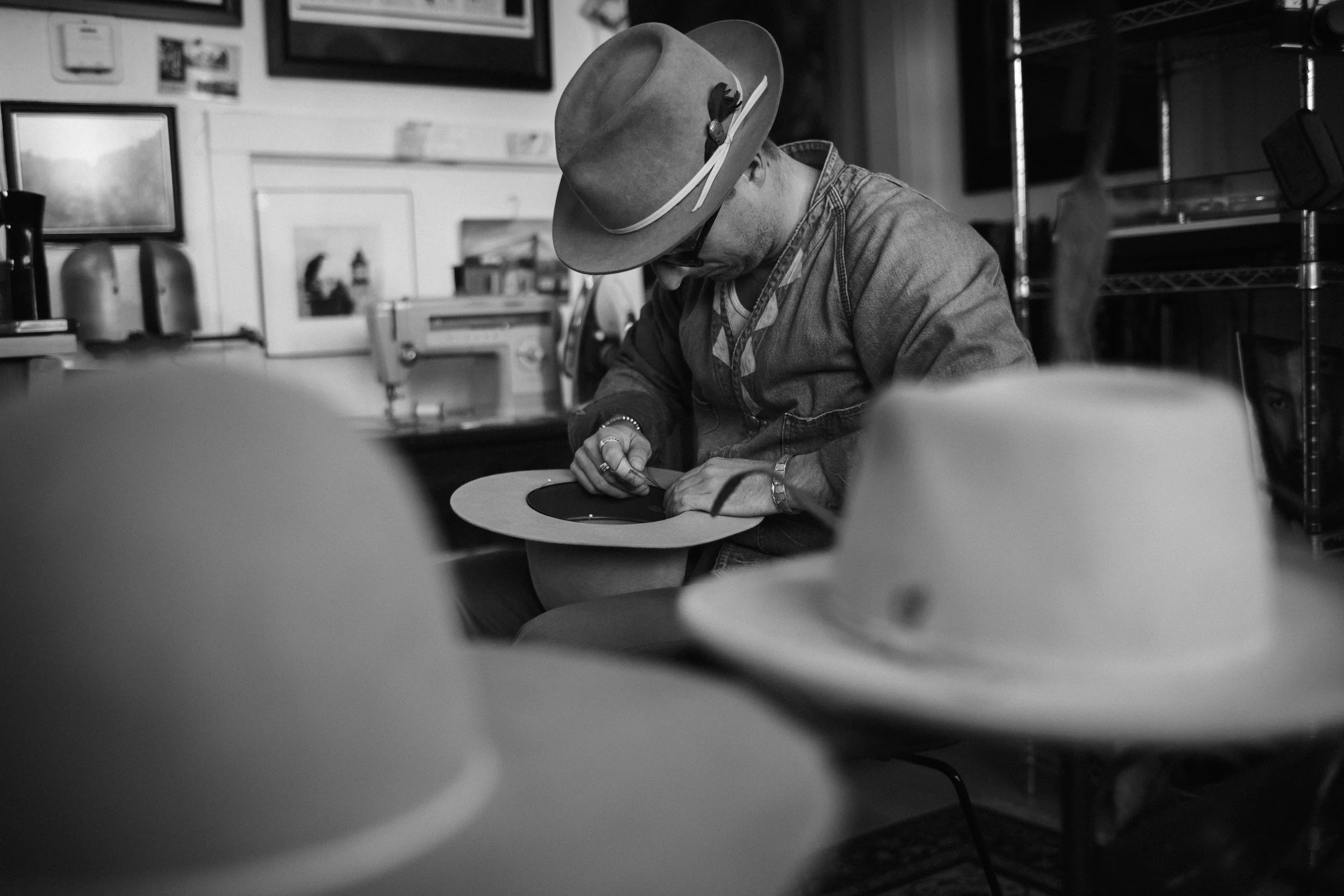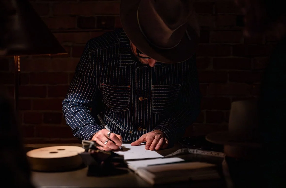 Clients commission their piece through a personal consultation — discussing fit, shape, materials, and character. From there, your hat is blocked, shaped, and finished by hand in the studio, built specifically for you.