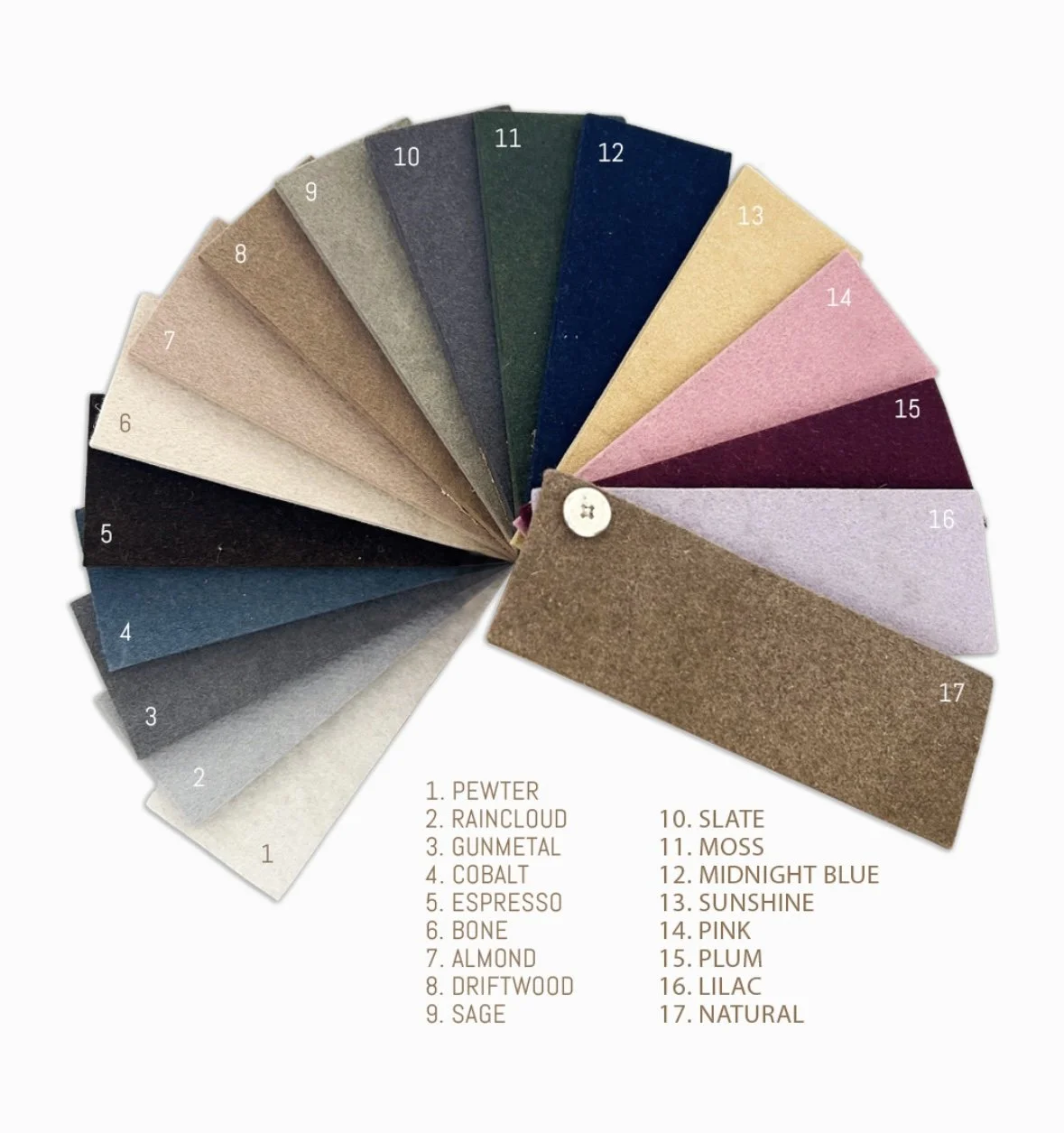 The felt itself arrives as an open canvas. From there, you’ll choose the color that speaks to your style — whether that’s something classic and understated or a shade that brings a little personality into the piece. The palette ranges from rich earth tones and warm neutrals to deeper moodier colors.